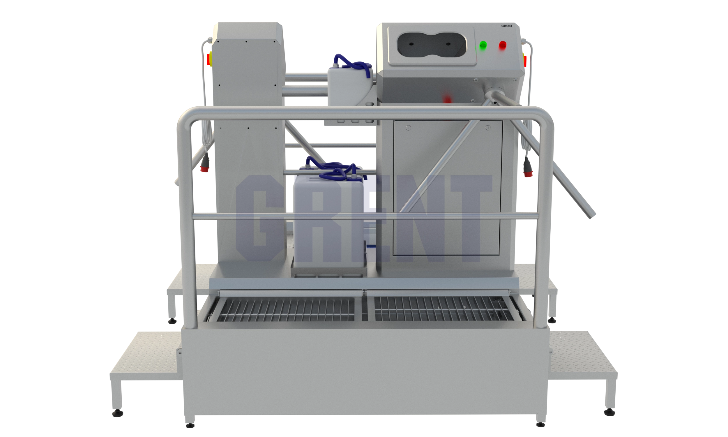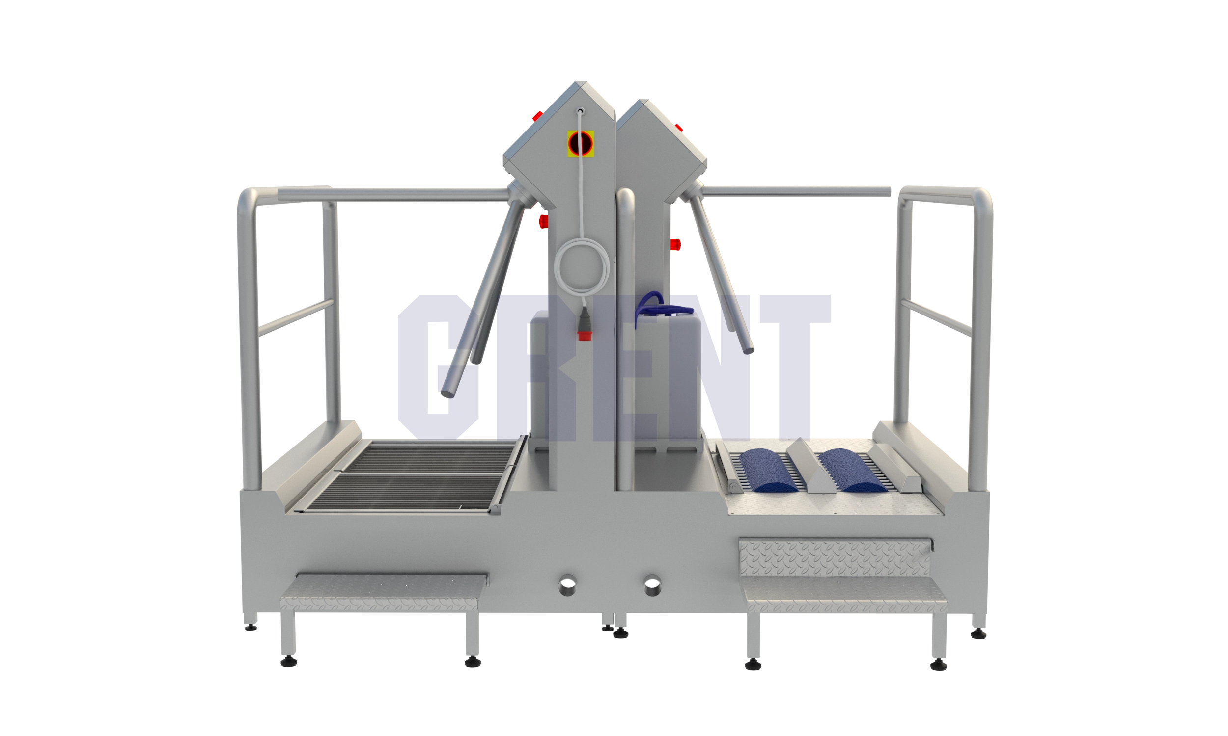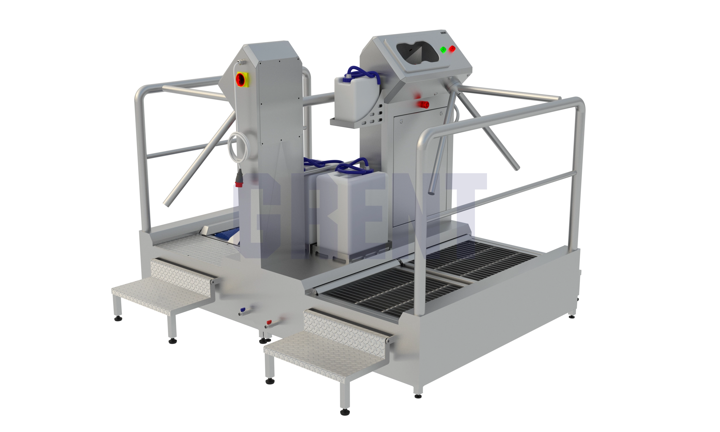 Двухсторонняя станция гигиены GRENT 025 P предназначена дезинфекции кистей рук и подошвы обуви при входе в чистые помещения на производстве.
