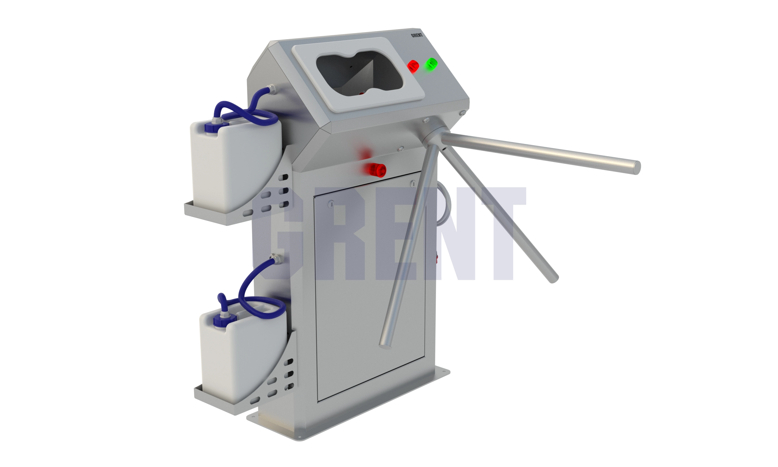 Станция гигиены рук GRENT 012 R предназначена для автоматической бесконтактной дезинфекции кистей рук персонала перед входом в чистую зону. Включение подачи дезинфицирующего средства происходит при поднесении обеих рук в зону срабатывания фотоэлементов, расположенных в дезинфицирующей камере. Дезинфицирующее средство подается автоматически при помощи электронасоса. Распыление дезсредства осуществляют 4 форсунки, расположенные в верхней и нижней части дезинфицирующей камеры, что обеспечивает обработку рук с двух сторон