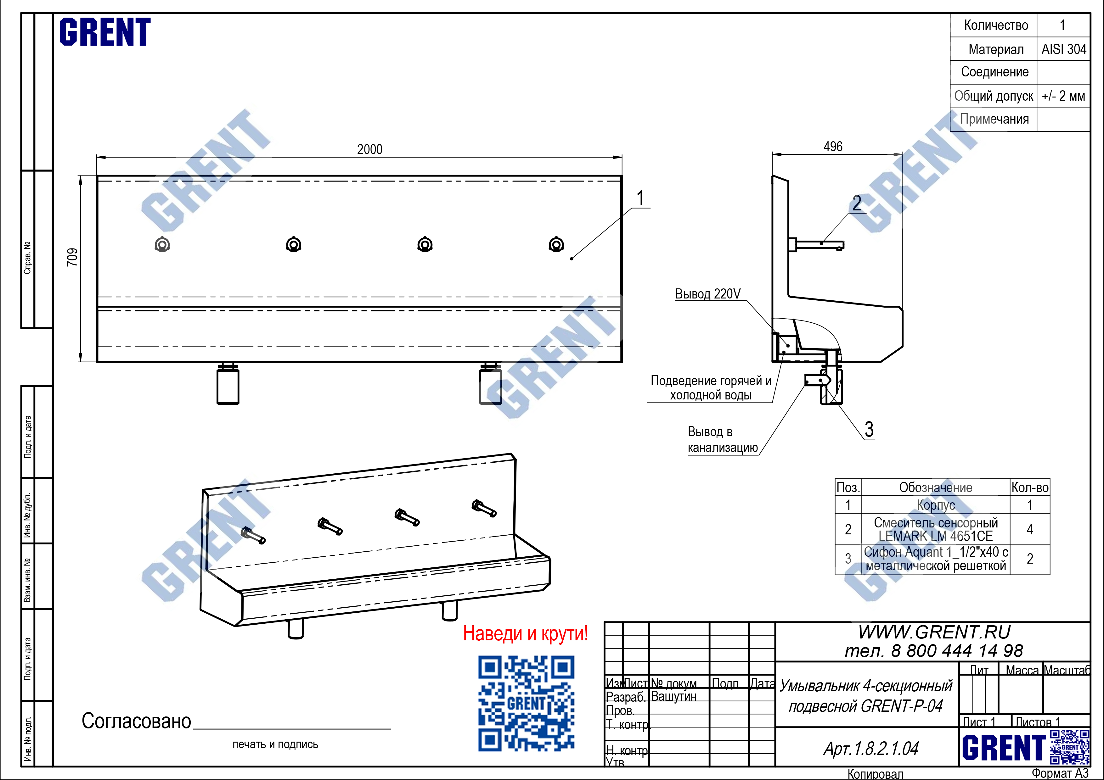 Четырех секционный умывальник GRENT-P-02 используется для бесконтактной мойки рук персонала преимущественно на предприятиях общепита и пищевой промышленности. Активация подачи воды осуществляться фотодатчиком при поднесении рук к смесителю.